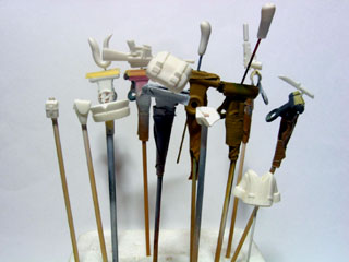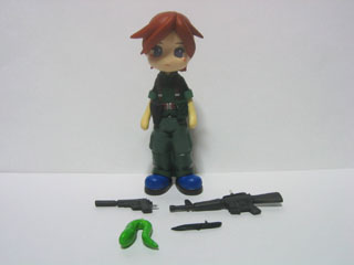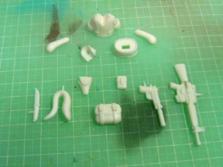 | ワンフェス2004夏で頒布していた重武装セットと同じしえるさんが原型製作したものです。 パーツ内容は、ボディパーツ3点(襟、本体、裾)、腕パーツ2種類(直立用、ライフル用)、バッグ、バックポーチ、ホルスター、手持ち武器4種類(ハンドガン、ライフル、ナイフ、生捕ヘビ)です。 |ω・).。oO(下に敷いてるマットが汚いのは勘弁してくれ) |