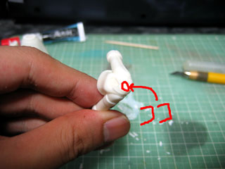 | 続けて手にも1mmのピンバイスで穴を開けます。 説明書には1.1mmってなってるけど持ってないんでね。 1mmで開けた後、1.5mmのピンバイスを一回しくらいすれば手持ちアイテムをスムーズに付け替えられます(はず…)。 ピンバイスを出してるついでに胴の真ん中辺りに塗装の持ち手用の穴も掘っておきます。 この後、中性洗剤(台所用洗剤)と歯ブラシを使って洗浄します。 |