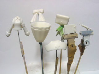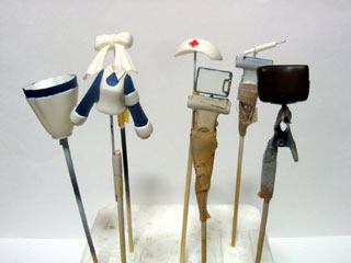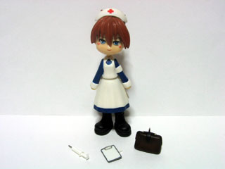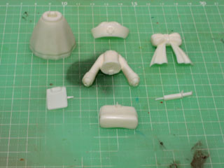 | パーツ内容は、本体2パーツ・リボン・ナースキャップ・カバン・注射器・カルテボードの7点。 まずは、バリ取りをします。 特に注射器のバリを取る時は、針の部分がかなり細いので注意が必要です。 |