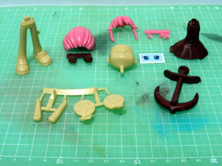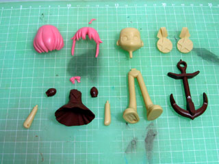 | パーツチェック。 目のデカールが入っているので、顔で失敗することはなさそう。 軽くバリ取って、ついでにピンバイスで穴を開けておきました。 それぞれの穴の大きさは、 リボン…1mm 肩…2mm 腕…2mm 髪飾り…1.5mm 首…3mm 後髪…2.5mm アホ毛…2mm です。 |