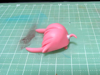 <2005.09.29> 気泡はまた溶きパテ塗って乾いてからヤスリがけ。 首は小さく丸めたエポパテ入れて頭を突っ込んで形にならすようにして調整。 その後、サフ噴きや塗装の時にアホ毛と前髪がバラバラだとアホ毛なくしそうな気がしたんで、接着しようとして角度調整してたら…アホ毛が根元からポッキリ折れたー・゜・(ノД`)・゜・。 あまりにも突然のことだったので、折っちゃったときの写真も撮り忘れた。 で、気を取り直してアルテコで修復。 ついでに根元の隙間も気になったのでそこにも盛って一体化。 |