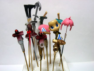 | 組み立てたら完成。 肩と腕は可動させられるので、接着せず差し込むだけ。 腰のジョイントがスカスカだったので、ここだけ接着。 どうせ組み替えないだろうしね。 で、ここでも惨事が。 髪飾り差し込もうとしたらピン折ったorz 塗幕の分だけ厚くなってたのに、グリグリやったらポッキリと。 瞬着でくっつけとけばいいよね? いろいろあったけど、ひとまず完成。 今まで作った中で一番大変だったかも?特に塗装が…。 |ω・).。oO(人に見せられるレベルじゃないよorz) |