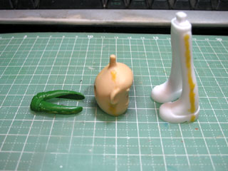 | 中性洗剤で洗った後に目立ったパーティングラインに光硬化パテを盛ります。 硬化したらあとはヤスるのみ。 他のパーツはそのままでは気泡やキズが見にくかったので、サフを噴いてから処理することに。 |