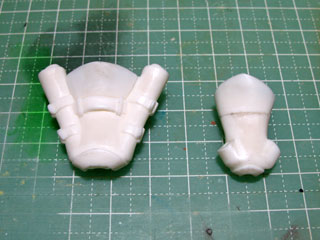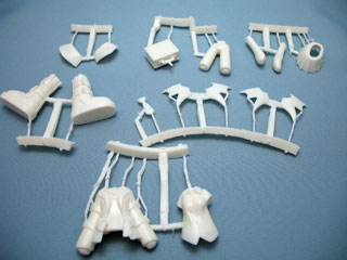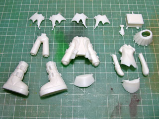 | 残しておいた部分(バリ)はデザインナイフで少しずつ削っていきます。 デザインナイフじゃ出来なくなったら紙ヤスリをかけてキレイにします。 ここまでやったら離型剤を落とすために中性洗剤+研磨剤をぬるま湯に溶いたモノで洗います。 普通はキットを開けたらまず洗うみたいですが…。 |