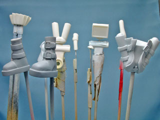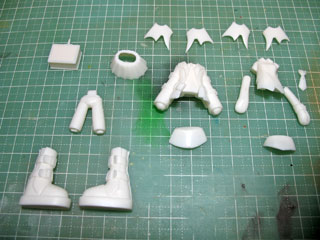 ヤスリがけが終わったらまたサフを噴きます。 自分が納得できるまでサフ噴き→ヤスリがけを繰り返します。 ブーツ・ジャケット・シャツはいつも使ってる白いサフ(ベースホワイト)じゃヤスリのかけ忘れた部分が分かりにくかったので、グレーのサフを噴いてあります。 ここで気になるトコもなくなったら塗装へ。 |