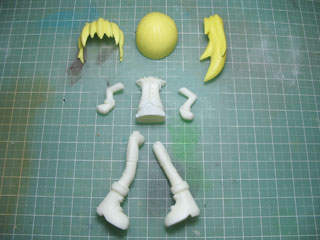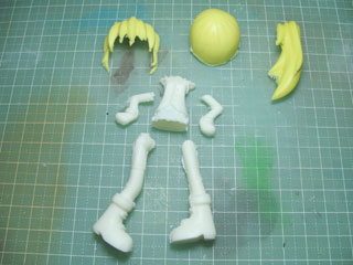 全パーツの下地処理が終わったので、塗装へ。 肌、髪、服、ブーツはエアブラシ使ったけど、黒の部分や細かい塗り分けは筆塗りで。 塗装が乾いたらクリアを噴きます。 髪はつや消し、髪以外には半光沢を噴きました。 |