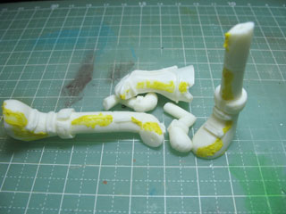 | バリ取りが終わったらまた洗浄して、ヤスリがけで出た粉とかを落とします。 水気がなくなったら、段差や気泡にパテを盛ります。 いつもはアルテコを使うんだけど、いろんなパテを使ってみたくて今回は買ったまま放ってあったポリパテを使ってみました。 黄色いのがポリパテを盛ったトコです。 |