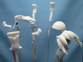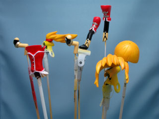 ポリパテが乾いたら400番の紙ヤスリやスポンジペーパー(240〜320番)でヤスリがけしていきます。 適当なトコまでやったので腕や足、髪の接続用に1mmの真鍮線を付けて仮組み。 顔はその辺に転がってた「はな」。 全然エクセレンっぽくねーw |