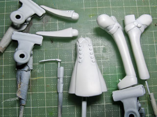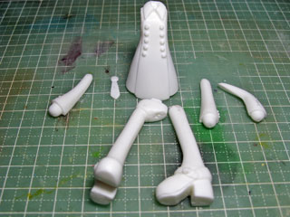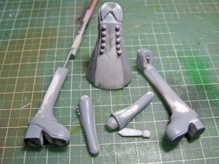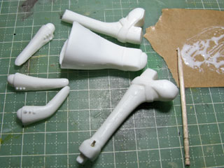 パーティングラインの段差や気泡にシアノン+アルテコ粉を盛ります。 足の付け根に2mmの穴開けて仮組みしたらダボ折っちゃったんで、1mmの真鍮線で軸打ち。 |