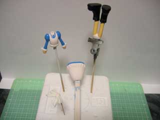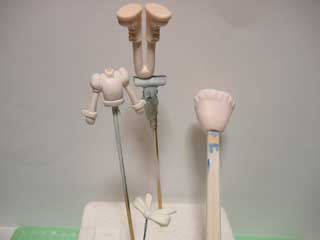 リボンは、真鍮線を通して所定の位置にくっつけて完成。 下半身パーツは、肌色がムラになったのとちょっとスカスカで固定できなかったとで余ったパーツで組んでみました。 瞬着で全部接着しちゃえばいいんだけど、何となく。 |