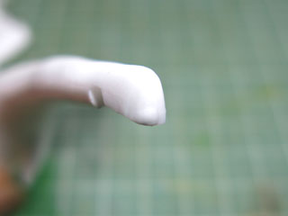 水気がなくなったら表面処理へ。 気泡やヤスリで消しきれなかったパーティングラインにアルテコ粉をシアノンで溶いたモノを盛ってきます。 盛るのはポリパテでもアルテコでも埋められるモノだったら何でもOKですよ。 シアノンは白いので目立たなくなるからだし。 |ω・).。oO(ちょっとこんもりしてるトコが盛ったトコです。) |