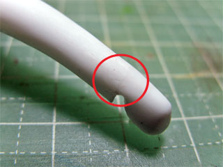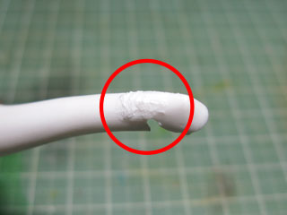 | パテが硬化したらヤスリがけ。 盛ったトコだけじゃなくパーツ全体もしっかりヤスリがけします。 髪に2mmのプラ棒挿そうとしたら赤丸のトコが折っちゃったorz 折れたトコを瞬着で接着して、その周りをシアノン+アルテコ粉を盛って硬化待ち。 |