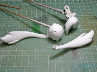 | ここで髪パーツにサフを噴いて表面の様子を見ます。 気泡やパテとの段差が見つかったらまた気泡埋めやヤスリがけをして処理します。 ヤスリがけ→サフを繰り返して満足できる表面になったら次へ。 |
