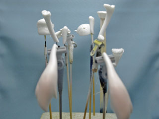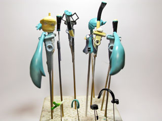 | 小物パーツにも持ち手をつけて、サフ噴き。 マイクはそれだけで塗装するのは厳しそうなので先に組んじゃいます。 ヘッドフォンの右に1mmの穴開けて接着してます。 |