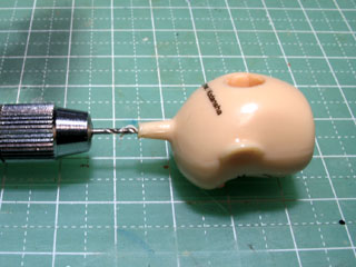 首の中心辺りに1mmのピンバイスで穴を開けます。 この時刃が曲がって入らないように確認しながらした方がいいです。 穴の深さは首の長さ+αくらいで。 |