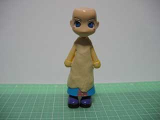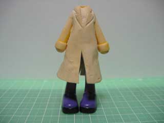 | で、おおまかにエポパテを盛ってみる。 裾の部分を長くしたいので、型取りのためにロングスカートを履かせた状態でパテを盛っていきます。 スカートは後ではずすので、メンソレータムを塗っておくのを忘れずに。 |