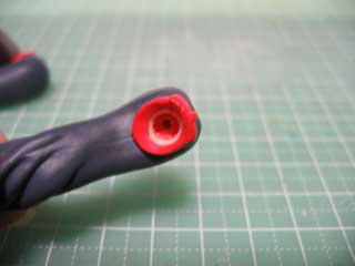 | ツインテールの方が凹になってるので、ここに軸径2mmのボールジョイントの受けの方を埋め込みます。 前もって2mmのピンバイスで穴を開けておきます。 使ったボールジョイントは、waveのB・ジョイント[ブラック]です。 別にボールジョイントじゃなく、2mmのプラ棒でもいいかと。 |