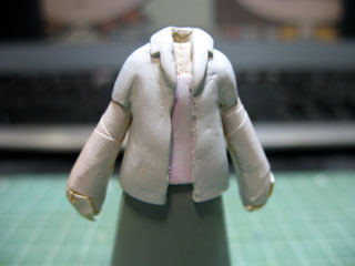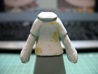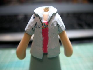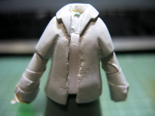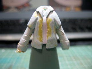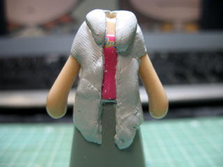 | 裾を伸ばしたかったのでスカートを組み合わせた状態でパテを盛っていきます。 スカートには硬化した時にパテがくっつかないようにメンソレータムを塗ってあります。 |