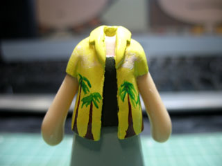 途中写真ないけど塗装終了。 ホントは花(ハイビスカスっぽい)のボーダー柄にしたかったんだけど、いくらやっても花に見えない物体にしかならなっかたのでヤシの木柄に。 柄はエナメル塗料で書いてあります。 キャミの色はもうちょっと薄くても良かったな。 迷彩にしようかとも思ってたけど暗すぎたので断念orz |