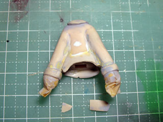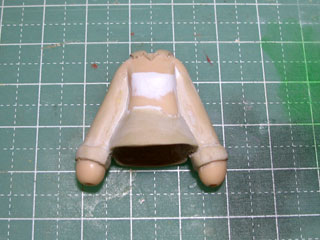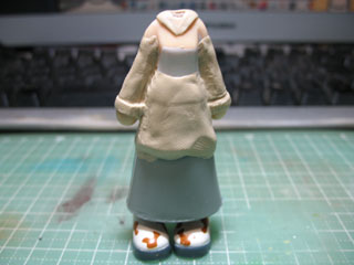| 裾を長くしすぎたのでデザインナイフでザクザク切ります。 |ω・).。oO(何か半分以上切ってる気がw) 襟もナイフで形を出していきます。 かなり凸凹してたので最初はスポンジヤスリでガシガシ削って、凸凹がなくなったら紙ヤスリでヤスリがけ。 |