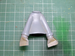 1回サフを噴いてみたらパテの継目が残ってたのでまたヤスリがけ。 またサフを噴こうと思って、洗ってた時にバリッと…orz 後だけ盛った部分を切り落として、またエポパテを。 今度は薄すぎたのかヤスリがけ中に切れ目がorzorz |ω・).。oO(写真撮り忘れたよ) 切れ目が出来たくらいだったので、裾の表と裏ににアルテコを盛って補強。 |