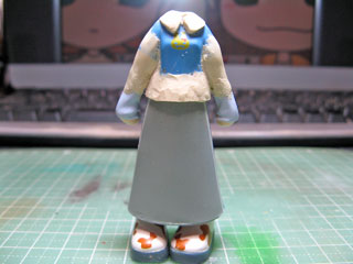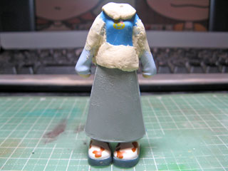 | まずは襟、袖、裾のトコにパテを盛ります。 裾は少し伸ばしたいのでメンソレータムを塗ったロンスカを付けて盛っておきます。 |