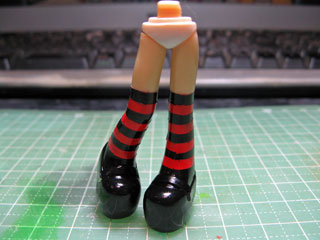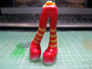 | 塗装へ。 ソックス部分を赤×黒の縞ニーソにしたかったので先に赤を塗ります。 赤が乾いたら縞になるようにマスキングテープを貼ってマスキングします。 少しでもテープが浮いてると上から塗った塗料が入り込むので、しっかり密着させるようにしときましょう。 |