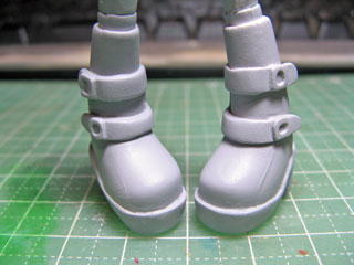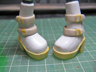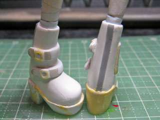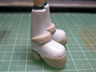 | 厚底にするためにソールにパテを盛ります。 ブーツで何のディテールもないんじゃ寂しいのでベルトぽいものを付けてみました。 |