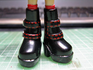 サフが乾いたら塗装を。 最初に靴下の部分を赤で塗ってから、全体を黒で塗ってからエナメルの赤でステッチを書いてみました。 最後に半光沢クリアを噴いたら完成。 |