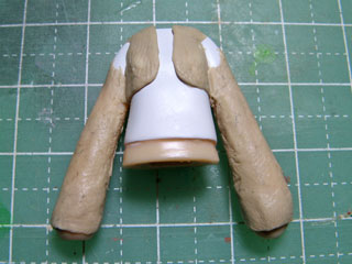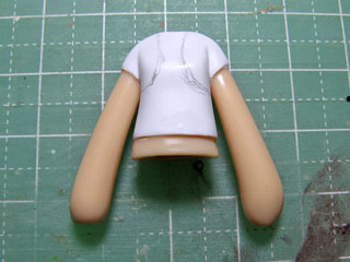 | エポパテを盛り付けます。 肩のラインはそのままにしたかったので、Tシャツの袖以外に盛ってます。 |ω・).。oO(この状態だとロンT+ショートベストに見えなくもないなぁw) |