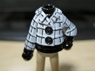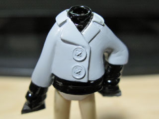 塗装の前にコトブキヤのMSG「フィギュアアクセサリー」のボタンを接着。 コートはニュートラルグレー+ホワイト、ハイネックはブラックで塗装。 コート部分はサフとあんま大差ない色になっちゃったorz |