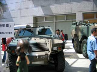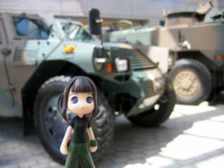 | 1人で会場を飛び出した萌の行く先は、いずこ? 萌「ここですわ。朝から気になってましたの。 せっかくこのようなお洋服を着ているのですから。」 と、萌が来たのは、自衛隊の車両が展示されてた所。 萌「軽装甲機動車?私には何のことか分かりませんわ。 お洋服着てるだけで見に来る場所ではなかったのでは?」 |