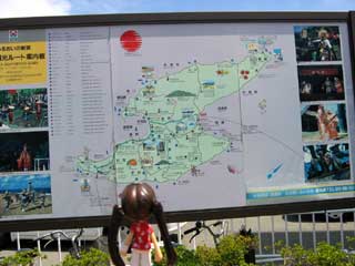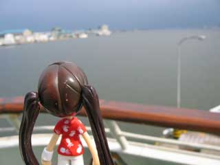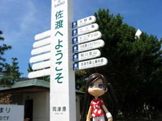2時間ほどの船旅を終え、ようやく佐渡の両津港に。 コ「こっちに着いたらすっかり晴れたね。」 途中での雨が嘘のように日差しが痛いほどの天気に。 |