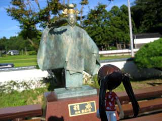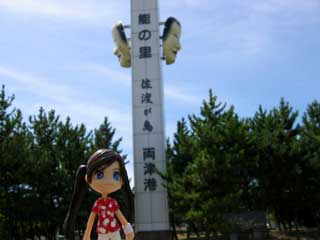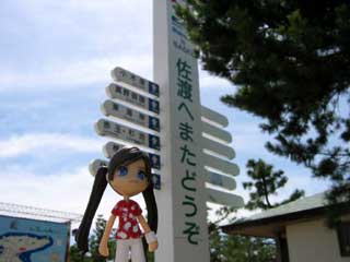 で、両津港に戻ってきたらこれが。 コ「佐渡の能って有名だったんだね。 そういえばさっきのとこの前に昭和天皇が行幸した際に ここで能を見たっていう碑があったね。」 |