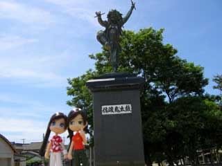 | ていうことで、鬼太鼓の像の前で記念写真。 佐渡っていろいろな古典芸能が残ってるんだね。 |
