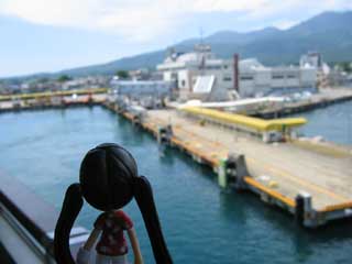海の方を見ているとカーフェリーが港へ。 コ「船が入ってきたから、そろそろ行かなきゃ。」 |