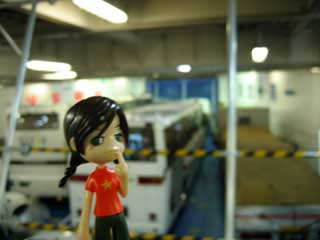 | なぜか船底の車置き場にたまえが・・・。 た「うまく乗り込めたようだな。さ、上に上がってみるか。」 |