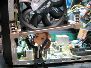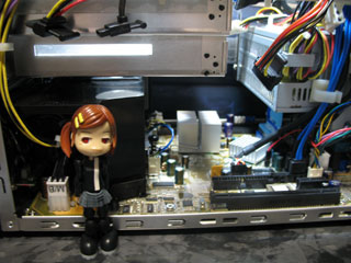 | タ「完成!結構簡単に出来るもんだね。 さ、キーボード・マウス・ディスプレイを繋いで動作するかチェックするよ。 ・・・・・・・・・・・・・・・・・・・・・動かないorz」 とまぁ、ここまでは順調だったのですがBIOSがCPUを認識しないというトラブル発生。 他のCPUがあれば何とか出来たのですが、あいにく持ってなかったもんでショップに持ち込んでBIOSアップデートしてもらってきました。 タ「こんなことにならないように調べてからパーツ選ぼうな。」 ※BIOS…パソコンのシステム全体を正しく起動させたりするもの。パソコン立ち上げた時にすぐ出る画面を動かしてるプログラム。 |