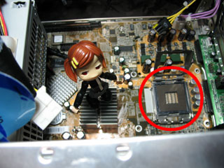 | タ「次はCPUの装着です。 ドライブベイやらCPUクーラーの今は使わない邪魔なパーツを外してCPUソケットを出してあげましょう。 赤丸のトコにCPUを挿します。」 ※CPU…コンピュータの頭脳みたいなもの。 ※CPUクーラー…CPUが動作中は熱を発するので、その熱を逃がしてあげるもの。 ※ドライブベイ…ハードディスクやDVDドライブを組み込む場所。 |