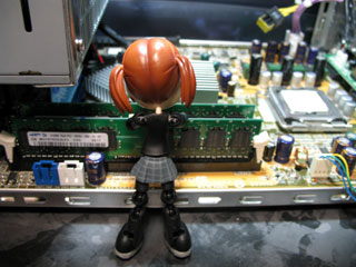 | タ「CPUを付けたら次はメモリを付けます。 決して定規ではありません。金色の端子をベタベタ触らないように。」 ※メモリ…ソフトを動かしてる時の作業机みたいなもの。容量が大きくなると動作が速くなります。 |