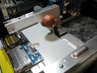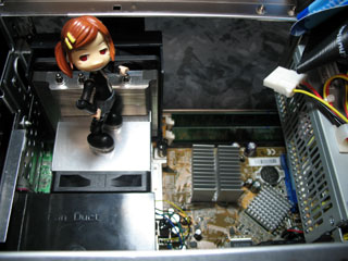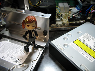 | タ「ドライブベイに取り付けたらケースに戻して、付属してたパーツで固定します。 ドライブに電源ケーブルとかのケーブルを付け忘れしないように。」 |