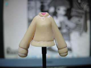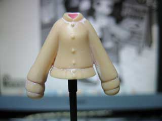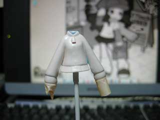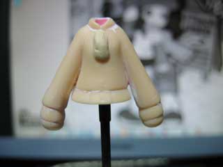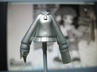 次はスライダー部分の作成。 ここには、エポパテ(ウェーブの軽量パテを使用)を適当な大きさに盛って、ある程度形を整えておきましょう。 硬化後、デザインナイフでいらない部分を切って、やすりで最終的な形を整えます。 管理人は手抜きでやってませんが、凝りたい人はチャックのところにスジ彫りを入れてもいいかも? |