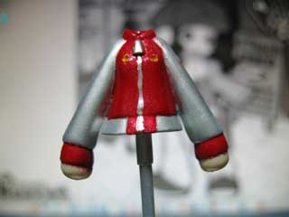 | で、後ろにも文字とデカールを。 筆だと太くなりそうだったから、楊枝を使って文字を入れました。 もちろんエナメル塗料で。 このデカールは、MYKデザインの1/35 90式戦車用です。 で、またまた乾燥するまで待って、トップコートを噴きます。 スカジャンぽさを出すために半光沢を使いました。 これでスカジャン完成! |