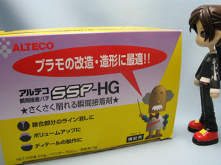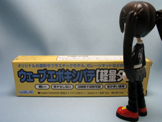 <瞬間接着パテ> いわゆるアルテコですね。 今はパッケージ変わって銀と黒の箱になってますが。 大き目の気泡埋めや段差埋め、紐のディテールを作るときとかに使ってます。 |